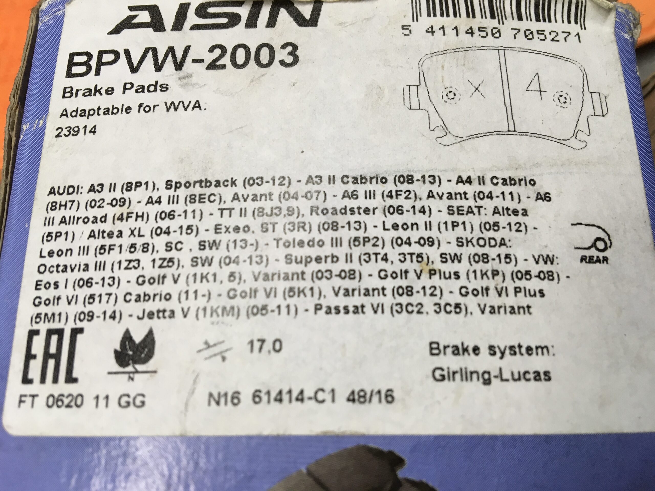 / Set of 4 brake pads – AISIN XBPVW2003 – 90R-02A01124/25677 VW AUDI